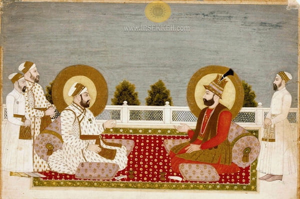 دیدار نادرشاه با محمد گورکانی (دایره نور مانند بر سر دو نفر نشانگر پادشاهی آن هاست.)