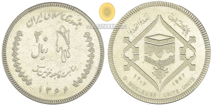 در 19 مرداد ماه 1366 در مراسم اعلام برائت از مشرکین واقعه ای اتفاق افتاد که منجر به کشته شدن 275 تن از حجاج ایرانی و 85 پلیس عربستانی گردید.این واقعه باعث ایجاد تنش عمیق در روابط دیپلماتیک بین ایران و عربستان شد. در داخل ایران، واقعه به فاجعه خونین مکه شهرت یافت و به این مناسبت این سکه ضرب گردید که در روی آن نوشته فاجعه خونین مکه و مبلغ 20 ریال و در پشت آن عبارت «ایها المسلمون اتحدوا اتحدوا» نوشته شده است. این سکه بعد از ضرب برای مشاهده و اعلام اجازه برای ضرب انبوه به تعدادی از مقامات و مسئولین وقت ارسال گردید ولی بنابه دلایلی مورد تایید قرار نگرفته و به ضرب انبوه نرسید