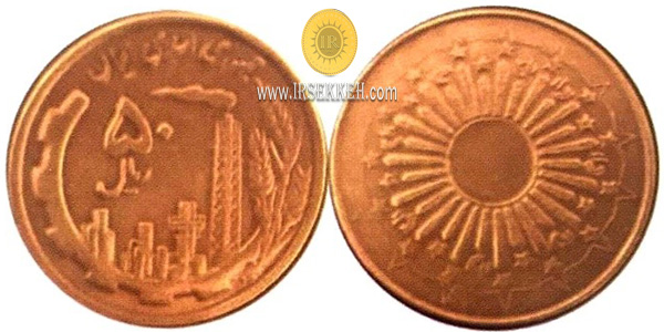 طرح اولیه سکه های 50 ریال مسی مطابق تصویر در سال 1359 در دوره ریاست جمهوری ابوالحسن بنی صدر ضرب شد.که بر روی آن تاریخ نوشته نشده و لعاب بانکیش کمی پر رنگ تر از سکه های مسی معمولی بود ودور کنگره نوشته بانک مرکزی ایران به زبان لاتین بود.طرج پشت سکه را ما در فیلگران اسکناس های 100 ریال بارگاهی مشاهده می کنیم.این طرح،آرم دولت موقت بود.که به جای شیر و خورشید مورد استفاده واقع می شد.به این سکه،سکه بنی صدری نیز می گویند.این سکه مورد تایید مسولین قرار نگرفت و به ضرب انبوه نرسید.به همین خاطر از این سکه فقط به صورت نمونه و تعداد بسیار کم در میان مجموعه داران دیده می شود.