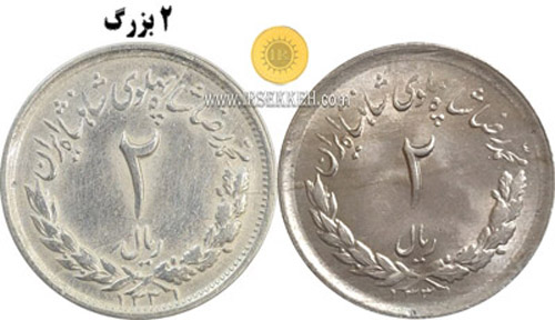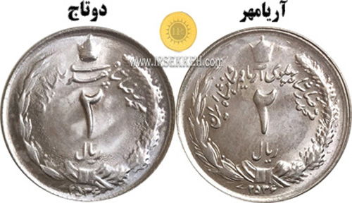 10- سکه های 1ریال و 2ریال و 5 ریال که دارای نوشته محمدرضا شاه پهلوی شاهنشاه ایران در روی سکه هستند را سکه دو تاج و آن هایی که دارای نوشته محمدرضا شاه پهلوی آریامهر شاهنشاه ایران هستند را سکه آریامهر می گویند.