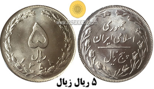 14- سکه 5 ریال زیال جزو واریته های 5 ریال 1358 است. در این سکه نقطه حرف «ن» کلمه پنج بر روی ر افتاده و به صورت زیال خوانده می شود.