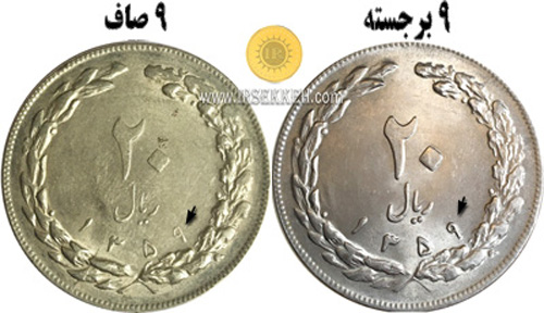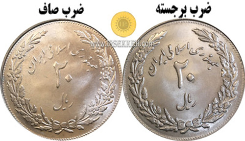 5- در بعضی از سکه های دوره جمهوری اسلامی به دلیل استفاده از قالب های مختلف مدل های ضرب برجسته و ضرب صاف به وجود آمده است که جزو واریته های فراوان محسوب می شوند.در مدل برجسته،برجستگی نقش های روی سکه نسبتا مشهود است. مشخصا در سکه 20 ریال 1359 از دو قالب متفاوت استفاده شده است که در صورت مقایسه می بینیم که نوشته های صورت سکه صاف و برجسته دیده می شوند.در میان مجموعه داران این سکه ضرب صاف، به سکه 9 تاریخ صاف نیز شناخته می شود.