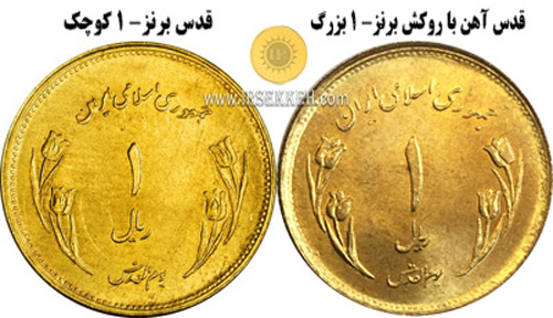 4- 1 ریال قدس دارای واریته ای برنزی است.که جزو سکه های کمیاب محسوب می شود که علاوه بر جنس سکه تفاوت های ظاهری با دیگر سکه های 1 ریال قدس نیز دارد.