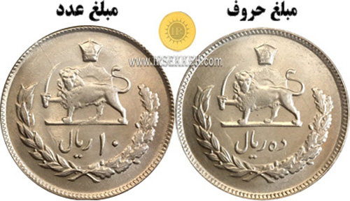 8- سکه 10 ریال 1352 محمدرضاپهلوی با دو قالب ضرب شده است.تمایز این سکه ها مبلغ پشت سکه می باشد که به صورت عددی یا حروفی نوشته شده اند.