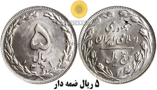 16- در پشت بعضی از سکه های 5 ریال 1361،1362،1363 در بالای کلمه جمهوری یک ضمه دیده می شود.که به سکه های ضمه دار مشهور هستند.