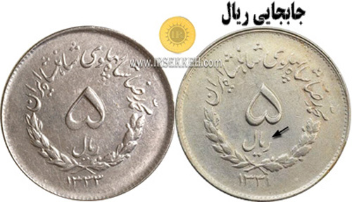9- در سکه های 5 ریال مصدقی،نوشته ریال به صورت ثابت در یک قسمت است. ولی در واریته سکه 5 ریال 1331 کلمه ریال چند میلی متر با فاصله تر از مکان اصلی اش ضرب شده است که به اصطلاح جابجایی ریال می گویند.