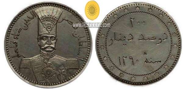 در سال 1290 «ه.ق» ناصرالدین شاه اولین سفر خود به فرنگ را انجام داد. برخلاف گفتمان رایج که مبنی بر خوش گذرانی بود. این سفر توسط میرزا حسین خان سپهسالار نخست وزیر اصلاح طلب وقت برای آشنایی بیشتر شاه با فرنگ و سبک زندگی نوین آن ها ترتیب داده شده بود. ناصرالدین شاه در این سفر به انگلستان رفته و از ضرابخانه برمینگهام نیز دیدن می کند. بنابه روایتی سکه دویست دینار به میمنت ورود پادشاه به انگلستان و به روایتی دیگر برای جلب نظر پادشاه برای ثبت سفارش و بستن قراردادی در این زمینه و گرفتن حق امتیاز ضرب سکه ایران در انگلستان بود.