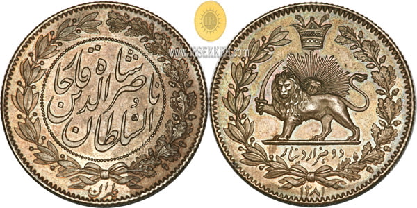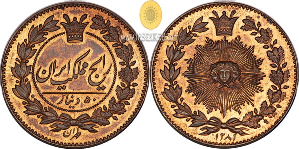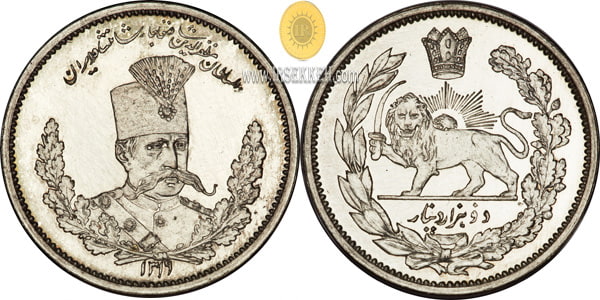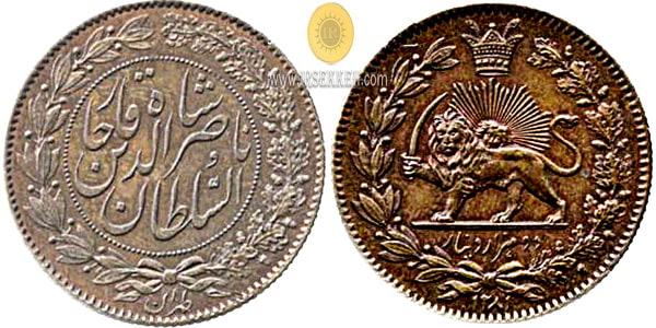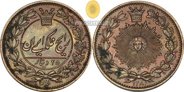 همانطور که می دانیم اولین سکه های ماشینی ایران در دوره ناصرالدین شاه ضرب شد. و وی تنها پادشاهی است که هم سکه چکشی و هم سکه ماشینی در حیات سیاسی خود دارد. اولین سکه های ماشینی ایران به مبالغ 25 دینار و 50 دینار (سایز بزرگ) و 1000 دینار (نیکل و مسی) و 2000 دینار نمونه توسط شخصی به نام مسیو داوس در فرانسه به تعداد محدود در سال 1281«ه.قمری» معادل 1243 «ه.شمسی» ضرب شدند. مدتی بعد سکه های نمونه ضرب شده و دستگاه و قالب های ضرب وارد ایران شد. در تهران شخصی به نام فرانز پشان اتریشی اقدام به ضرب سکه با همان قالب ها کرد. چون هر دو سکه ضرب شده (در فرانسه و ایران) با یک قالب بودند، بنابراین تشخیص مکان ضرب از روی سکه غیر ممکن است. این سکه های ضرب شده توسط مقامات مورد تایید قرار نگرفتند و فرانز پشان با کوچک تر کردن ابعاد قالب سکه های 25 دینار و 50 دینار و حک کردن مخفف اسم خود FP بر پشت سکه ها، ضرب اولین سکه های جدید ماشینی و تولید انبوه آن از سال 1293«ه.ق» معادل 1254 «ه.ش» را شروع کرد.