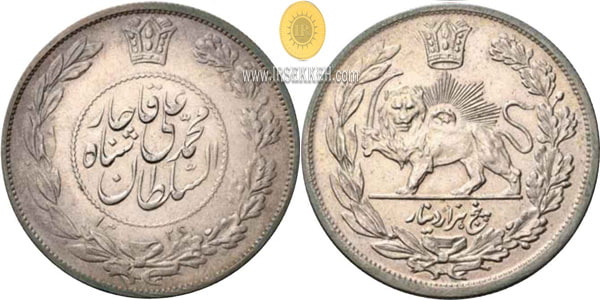 سکه های محمد علی شاه از سال 1325 تا 1327 ضرب شدند. سکه پنج هزار دینار خطی محمد علی شاه به عنوان نمونه و در سال 1326 ضرب شد ولی بنا به دلایلی مورد تایید قرار نگرفته و در سال 1327 نمونه تصویری این سکه ضرب و به تولید انبوه رسید.
