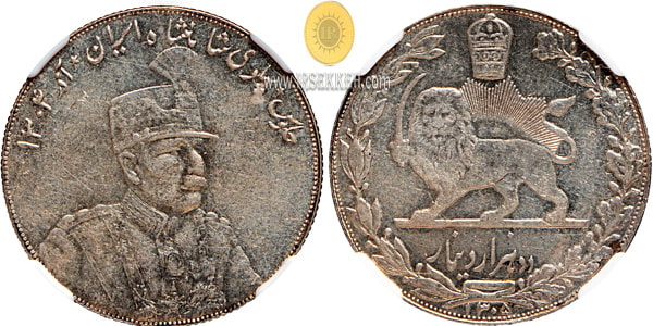 با انقراض حکومت قاجاریه و به قدرت رسیدن رضاخان اسکناس های قاجاری تا سال 1311«ه.ش» در جامعه استعمال می شد. ولی از همان اوایل اقدامات لازم برای جمع آوری سکه های احمد شاه قاجار انجام شد. ضرابخانه نیز سکه هایی با عنوان «رضاشاه پهلوی شاهنشاه ایران» و «رایج مملکت ایران» ضرب کرد. در سال 1305 اولین تقاضا برای ضرب سکه تصویری رضا شاه به ضرابخانه بروکسل (بلژیک) داده شد. سکه نمونه 2000 دینار و 5000 دینار با تمثال رضاخان ضرب و به ایران ارسال شد. (سکه های 500 و 1000 دینار این نمونه تصویری تا به امروز دیده نشده است). ولی بنابه دلایلی که تا امروز در پرده ای از ابهام است این سکه مورد تایید قرار نگرفت. و نمونه های جدید با تمثال رضا شاه از سال 1306 «ه.ش» طراحی و در ضرابخانه های «هیتون انگلستان» و «تهران» و «لنینگراد روسیه» ضرب و به تولید انبوه رسیدند که امروزه در آلبوم اکثر مجموعه داران دیده می شوند. لازم به ذکر است که از این سکه فقط دو مورد دیده شده است و جزو مسکوکات نایاب تاریخ سکه های ماشینی ایران می باشد.