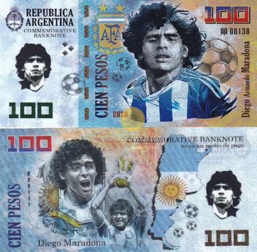 چاپ اسکناس هایی با تصویر دیگو مارادونا در ارژانتین نظر خیلی از علاقمندان به این اسطوره را جلب کرد. این اسکناس به دلیل طراحی زیبا و رنگ بندی متوازن جزو زیباترین اسکناس های آرژانتین می باشد.