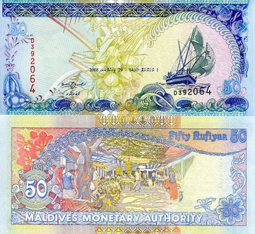اسکناس کشور مالدیو دارای رنگ بندی منحصر به فردی است و علاوه بر اشاره به فرهنگ محلی در این کشور به صورت خاص با تصاویر نارگیل چاپ شده است. نارگیل نماد کشور مالدیو می باشد و سالانه میلیارد ها دلار صادرات نارگیل و محصولات نارگیلی به دیگر کشور ها را دارد. این اسکناس به زیبایی، این نماد ملی فرهنگی را به تصویر می کشد.