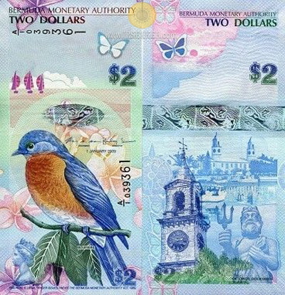 اسکناس دو دلاری برمودا با تصویر پرنده ومجسمه نپتون و برج ساعت و با رنگ بندی های زیبا.این اسکناس علاوه بر تاکید بر حقوق حیوانات نماد های ملی کشور برمودا را با طراحی زیبا به تصویر می کشد.