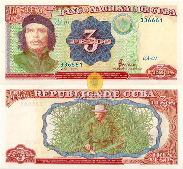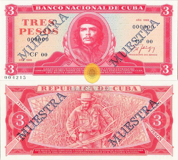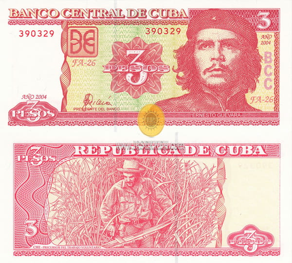 معمولا در دنیا اسکناس های یادبودی بارقم 3 چاپ می شوند که در مورد چگوارا نیز این اصل صدق می کند.اسکناس های 3 پزو کشور کوبا با رنگ بندی قرمز و تصویر مشهور چگوارا بر روی اسکناس و هم چنین تصویر کار کردن وی در مزرعه در پشت اسکناس چاپ شده است. تصویر پشت اسکناس بیشتر نمایانگر اهداف و آرمان های مارکسیستی است که به کارگر ارج نهاده و مخالف نظام سرمایه داری و جامعه ای با شکاف طبقاتی بوده و هست. اسکناس های چگوارا زمانی آنقدر در ایران خواهان داشت که اصناف به صورت بسته یا باکس، این اسکناس ها را خرید و فروش می کردند.
